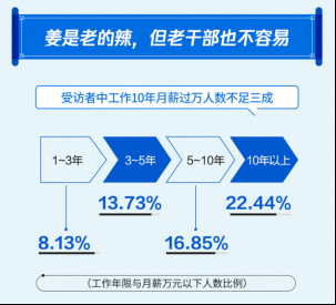 此外,受訪者月薪過萬人數(shù)與隨著工作年限遞增,但工作10年月薪高于1萬的人數(shù)依然不足三成。報(bào)告顯示,工作10年以上的受訪者中月薪過萬人數(shù)比例為22.44%、工作5-10年月薪過萬人數(shù)比例為16.85%、工作3-5年月薪過萬人數(shù)比例為13.73%、而工作1-3年月薪過萬人數(shù)比例是8.13%。這也從側(cè)面說明了工作經(jīng)驗(yàn)不是影響工資水平的唯一因素,想要得到高薪,經(jīng)濟(jì)環(huán)境、工作地域、從事行業(yè)等因素也至關(guān)重要。