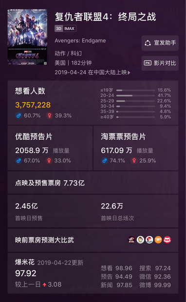 值得注意的是,淘票票×優(yōu)酷雙端合并平臺的“想看+預約”數超500萬,雙端預告片播放量破2600萬,打破進口片想看+預約”紀錄,成為全網第一。淘票票打造的“漫威社區(qū)”突破450萬訪問,“想看人數”達到370萬(如圖),想看、評分和評論都是平臺沉淀下的重要數據,它代表著用戶粘性和平臺依賴度。