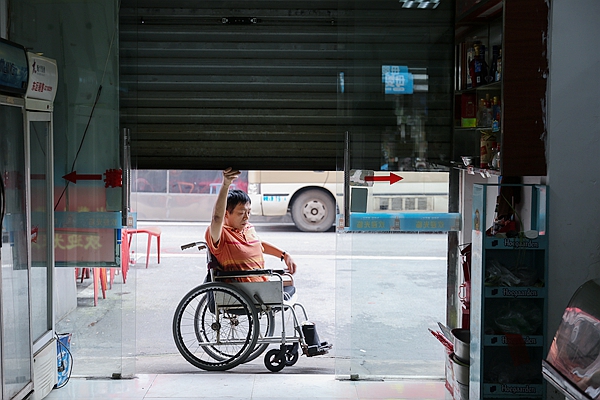初見(jiàn)彭水林,他肚臍以下已全部截去,兩根直接連接腎臟的軟管用來(lái)排尿,大便排泄則通過(guò)人造肛門(mén)完成。令人不敢相信的是,這樣的他,能夠熟練地拉開(kāi)位于在長(zhǎng)沙城東芙蓉區(qū)“沁園”小區(qū)岔路口——“半截人便利店”的那道厚重的卷閘門(mén)。卷閘門(mén)徐徐升起,三世同堂的他抱著孫女,就這樣開(kāi)始了一天的工作。