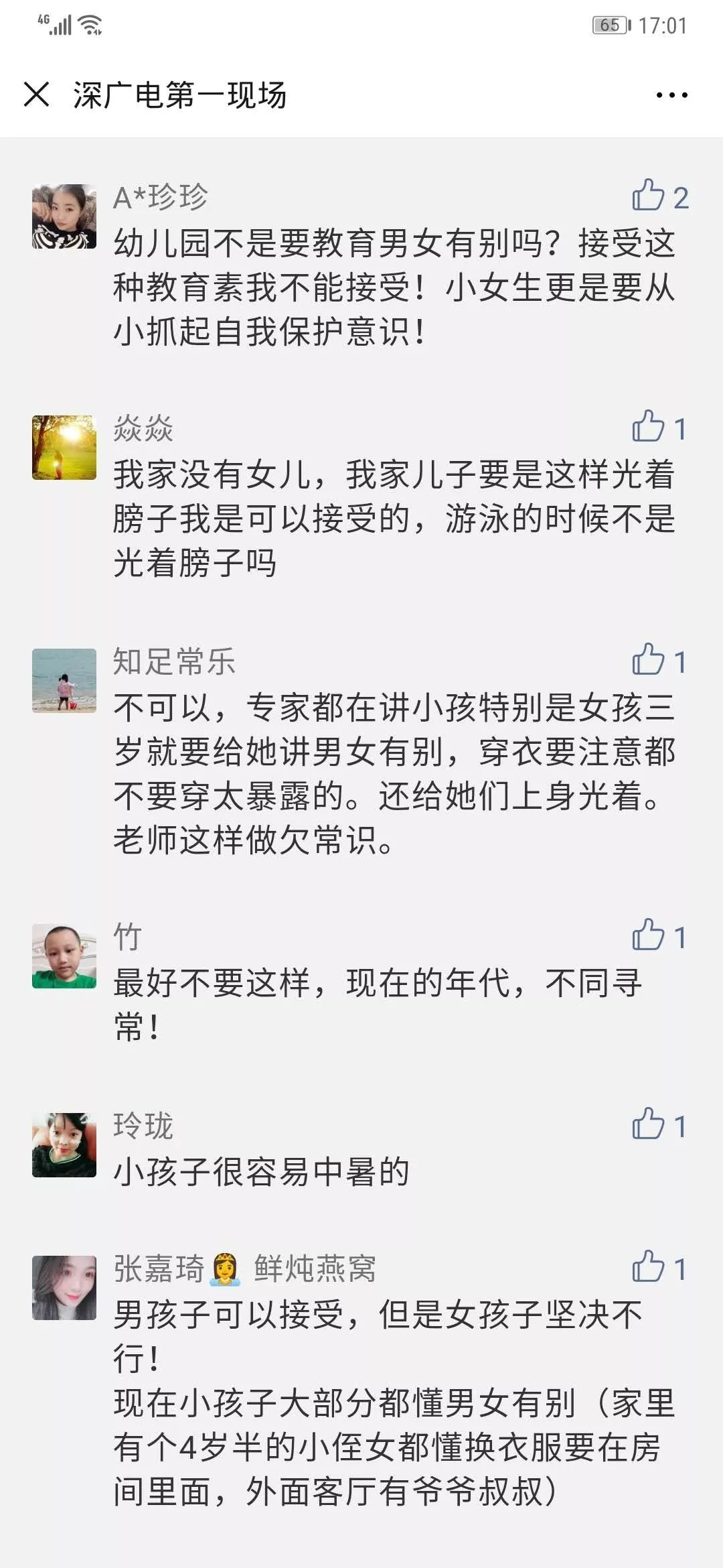 節(jié)目播出后,在第一現(xiàn)場(chǎng)微信公眾號(hào)上進(jìn)行的話題投票中,有74%的觀眾都認(rèn)為無(wú)法接受女兒在幼兒園光著上身日光浴,另外有50%的人認(rèn)為無(wú)法接受兒子進(jìn)行同樣的行為。