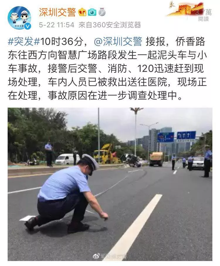 據(jù)@深圳交警官方微博消息,10時(shí)36分,僑香路東往西方向智慧廣場路段發(fā)生一起泥頭車與小車事故,接警后交警、消防、120迅速趕到現(xiàn)場處理,車內(nèi)人員已被救出送往醫(yī)院,現(xiàn)場正在處理,事故原因在進(jìn)一步調(diào)查處理中。