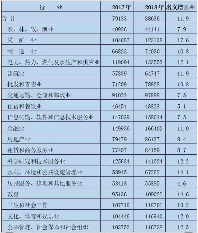 (2018年城鎮(zhèn)非私營單位分行業(yè)就業(yè)人員年平均工資。單位:元,%)