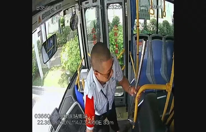監(jiān)控顯示:6月8日中午12點27分左右,司機(jī)熊師傅正常駕駛車輛,這時身旁的一名穿黑色上衣的男乘客突然跌倒在地。熊師傅發(fā)現(xiàn)后,急忙將車輛行駛到安全地帶停放,并向男乘客詢問情況。