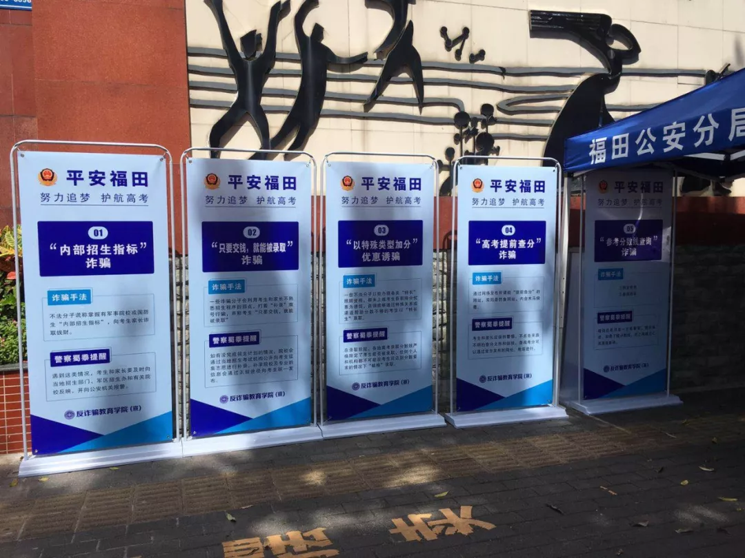 高考結(jié)束后,與高考相關(guān)的一些詐騙也進入了活躍高峰期。福田分局制作了高考反詐騙相關(guān)展板,在全區(qū)范圍內(nèi)的6個考點出入口顯眼處擺放,提醒告誡考生及家長注意高考相關(guān)詐騙手法。