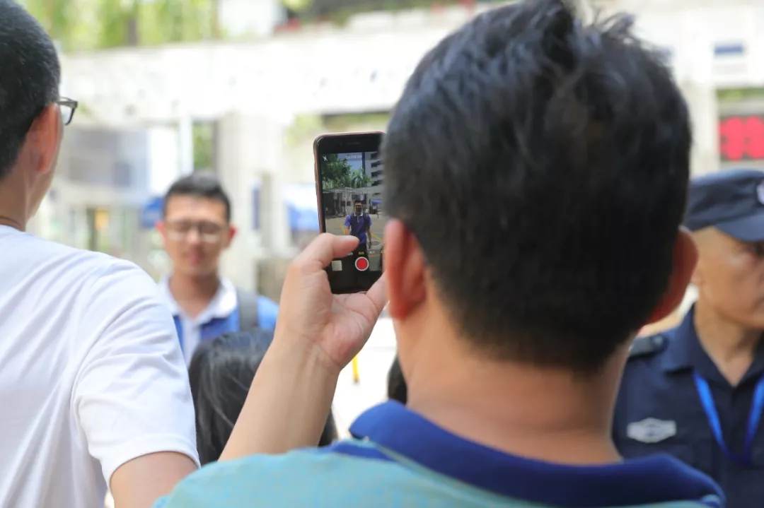 △考場外焦急等待的考生家長紛紛拿出手機準備拍攝邁出考場的孩子。