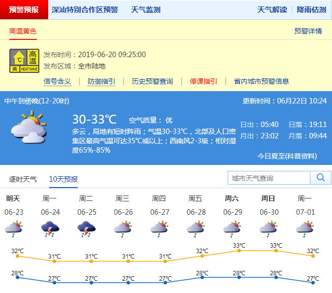 深圳新聞網(wǎng)2019年6月22日訊 受副熱帶高壓的影響,近幾日深圳氣溫持續(xù)上升,昨日(夏至)白天最高氣溫32℃~34℃,中北部及人口密集區(qū)最高氣溫達到35℃以上,全市高溫黃色預警生效中。周末恰逢中考到來(6月22日至24日),預計22日天氣炎熱到酷熱,中北部及人口密集區(qū)最高氣溫可達35℃或以上,提醒考生家長出門做好防暑降溫措施。