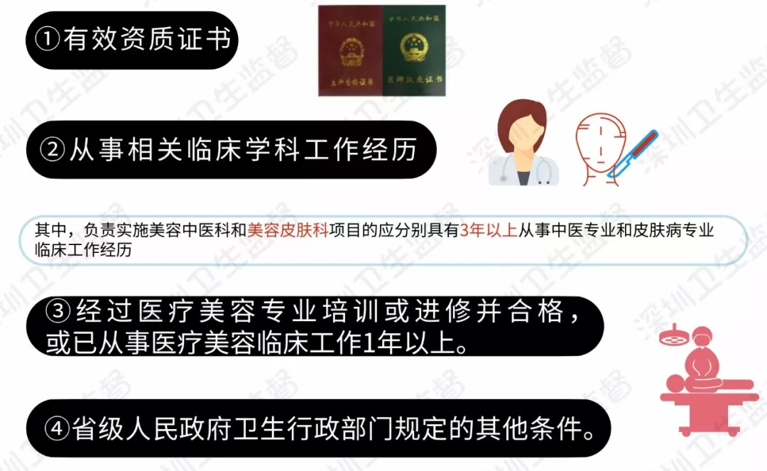 (二)具有從事相關(guān)臨床學(xué)科工作經(jīng)歷。其中,負責實施美容外科項目的應(yīng)具有6年以上從事美容外科或整形外科等相關(guān)專業(yè)臨床工作經(jīng)歷;負責實施美容牙科項目的應(yīng)具有5年以上從事美容牙科或口腔科專業(yè)臨床工作經(jīng)歷;負責實施美容中醫(yī)科和美容皮膚科項目的應(yīng)分別具有3年以上從事中醫(yī)專業(yè)和皮膚病專業(yè)臨床工作經(jīng)歷;(三)經(jīng)過醫(yī)療美容專業(yè)培訓(xùn)或進修并合格,或已從事醫(yī)療美容臨床工作1年以上;(四)省級人民政府衛(wèi)生行政部門規(guī)定的其他條件。