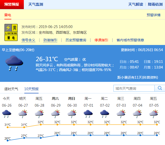 市氣象局預(yù)計深圳今日氣溫26-31℃;陰天間多云,有陣雨或雷陣雨,部分時間雨勢較大;西南風(fēng)2-3級;相對濕度70%-95%。提醒市民未來幾天雷陣雨多發(fā),注意躲避雷暴和局地短時強降水。
