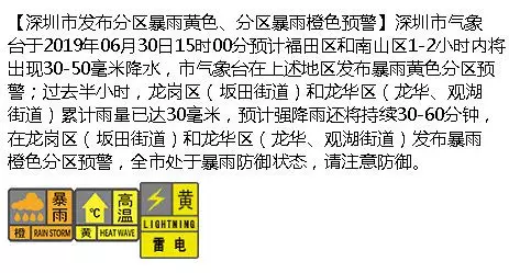 于14時40分起先后在寶安區(qū)、龍華區(qū)、南山區(qū)、福田區(qū)和龍崗區(qū)(南灣、坂田、平湖、布吉、吉華街道)發(fā)布暴雨黃色預警,在龍崗區(qū)(坂田街道)和龍華區(qū)(龍華、觀湖街道)將暴雨黃色升級為暴雨橙色預警。