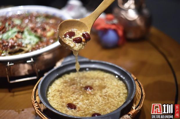 紅糖陰米粥作為主食,溫潤甘甜,口感濃稠,小米粥里熬煮了紅棗枸杞,補血補氣,在一眾重油的江湖菜中可以解辣解膩,還能感受酒糟帶來的養(yǎng)生驚喜。