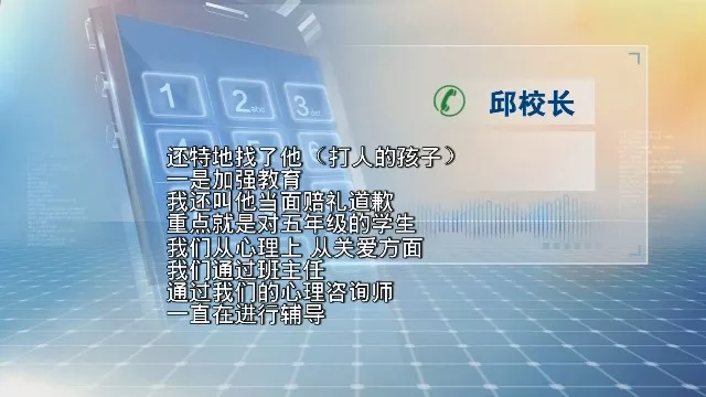 隨后記者前往了小詹所在的小學(xué)。邱校長(zhǎng)表示打人者彬彬本身是一個(gè)自控力較弱的學(xué)生,他們此前也有進(jìn)行過(guò)多次批評(píng)教育,而這次事發(fā)在非上課時(shí)間的校外,他們也有立即介入對(duì)事情進(jìn)行了解,并且協(xié)調(diào)雙方進(jìn)行協(xié)商,在小詹出現(xiàn)應(yīng)激反應(yīng)后,他們也立馬聯(lián)系了心理醫(yī)生進(jìn)行輔導(dǎo)。