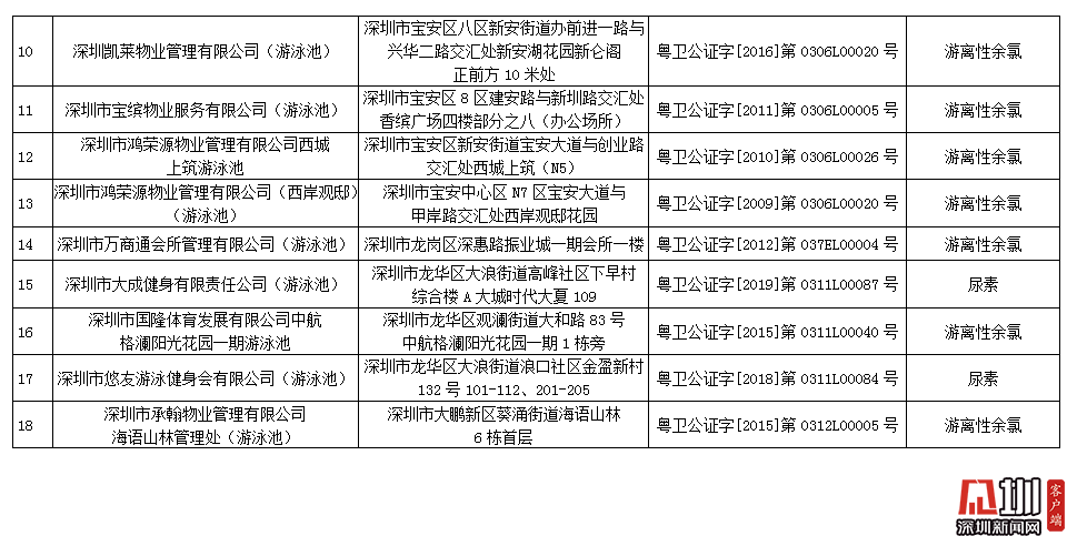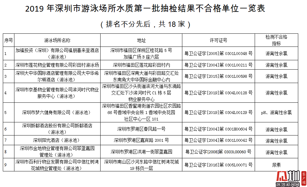 記者獲悉,深圳市夢(mèng)六健身有限公司(游泳池)pH值和游離性余氯指標(biāo)不合格,深圳市百利行物業(yè)發(fā)展有限公司中信紅樹灣花城物業(yè)管理處(游泳池)、深圳市大成健身有限責(zé)任公司(游泳池)、深圳市悠友游泳健身會(huì)有限公司(游泳池)尿素指標(biāo)不合格,加福投資(深圳)有限公司福朋喜來登酒店(游泳池)、深圳市蓮花物業(yè)管理有限公司彩田村游泳場(chǎng)、深圳大中華國(guó)際酒店管理有限公司大中華希爾頓酒店(游泳池)、深圳市京基物業(yè)管理有限公司濱河時(shí)代物業(yè)服務(wù)中心(游泳池)、深圳新都酒店股份有限公司新都酒店(游泳池)、深圳陽(yáng)光酒店(游泳池)、深圳市金地物業(yè)管理有限公司翠盈嘉園管理處(游泳池)、深圳凱萊物業(yè)管理有限公司(游泳池)、深圳市寶繽物業(yè)服務(wù)有限公司(游泳池)、深圳市鴻榮源物業(yè)管理有限公司西城上筑游泳池、深圳市鴻榮源物業(yè)管理有限公司(西岸觀?。ㄓ斡境兀⑸钲谑腥f商通會(huì)所管理有限公司(游泳池)、深圳市國(guó)隆體育發(fā)展有限公司中航格瀾陽(yáng)光花園一期游泳池、深圳市承翰物業(yè)管理有限公司海語(yǔ)山林管理處(游泳池)游離性余氯指標(biāo)不合格。衛(wèi)生監(jiān)督部門已責(zé)令抽檢結(jié)果不合格單位立即整改,并跟蹤整改情況。