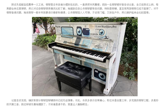 不知你們發(fā)現沒有,在華強北地鐵口以及周邊的空曠遮蔭處,擺放了8架鋼琴,市民可以免費使用。