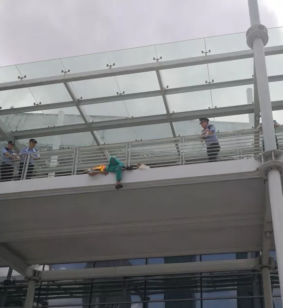 “阿伯,您先上來,別沖動!我們是警察,遇到什么困難跟我們說,我們盡量幫您解決!”吳第警官和緩地對男子說。然而男子并不配合,甚至在外欄桿上躺下了。這個舉動讓在場的所有人都倒吸了一口冷氣。
