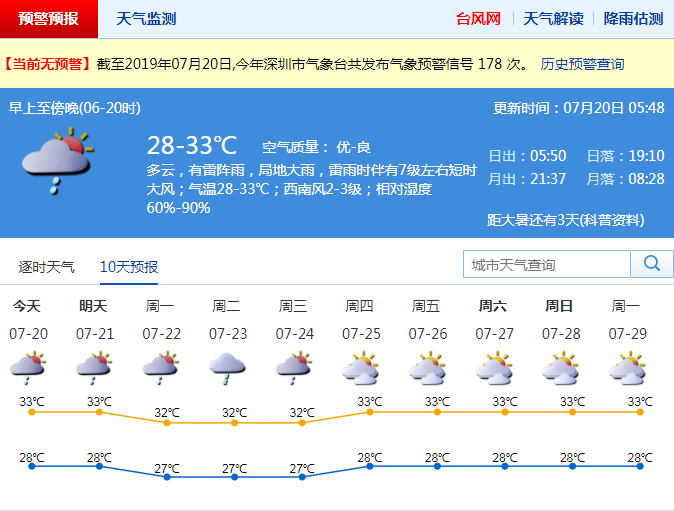 深圳新聞網(wǎng)2019年7月20日訊 昨日午后,我市出現(xiàn)中到大雨局部暴雨,并出現(xiàn)8-9級的短時大風(fēng)。深圳市氣象臺先后發(fā)布雷電、大風(fēng)藍(lán)色、暴雨黃色和分區(qū)暴雨橙色預(yù)警信號。這場雨帶來的降溫效果明顯,持續(xù)多日的高溫緩解,預(yù)警解除。