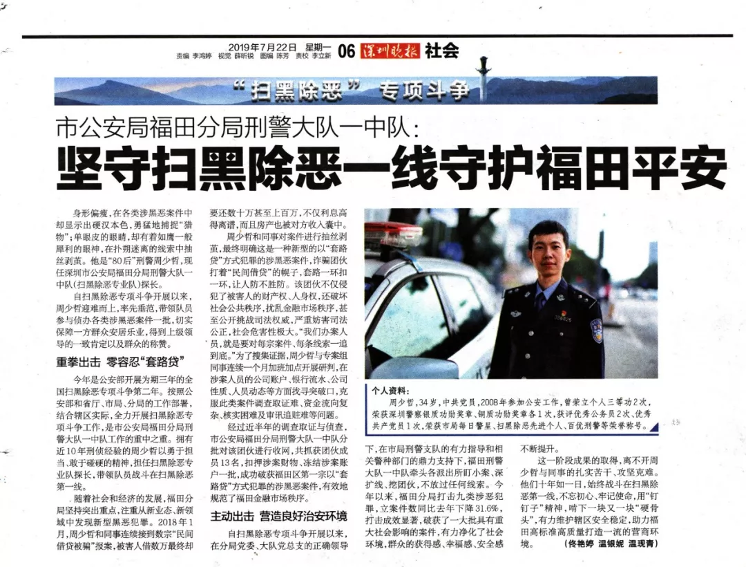 身形偏瘦,在各類涉黑惡案件中卻顯示出硬漢本色,勇猛地捕捉“獵物”;如鷹一般犀利的眼神,在撲朔迷離的線索中抽絲剝繭。他是“80后”刑警周少哲,現(xiàn)任深圳市公安局福田分局刑警大隊一中隊(掃黑除惡專業(yè)隊)探長。
