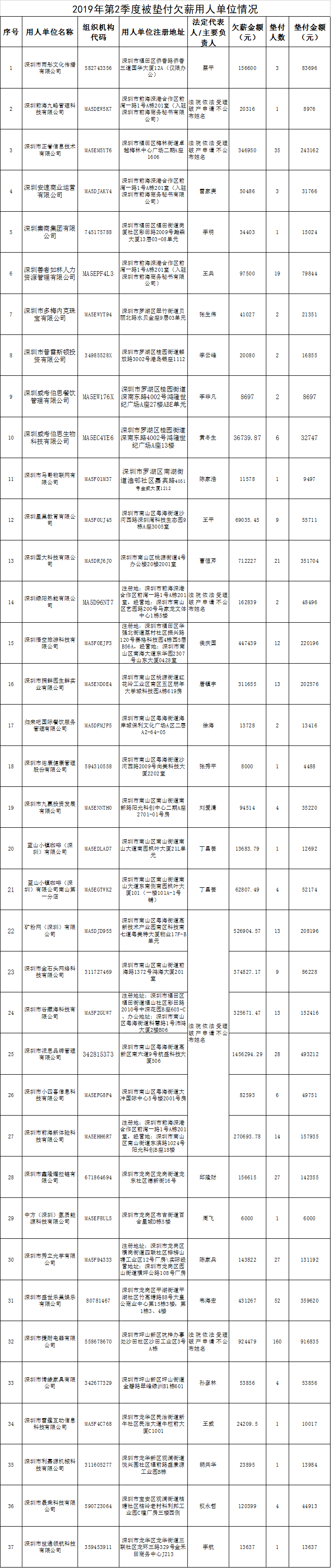 深圳特區(qū)報2019年8月1日訊 深圳市人力資源和社會保障局日前曝光了37家被墊付欠薪企業(yè),對2019年第2季度拖欠員工工資并由我市各區(qū)人力資源部門啟動了市欠薪保障基金墊付員工工資的用人單位情況予以通告。