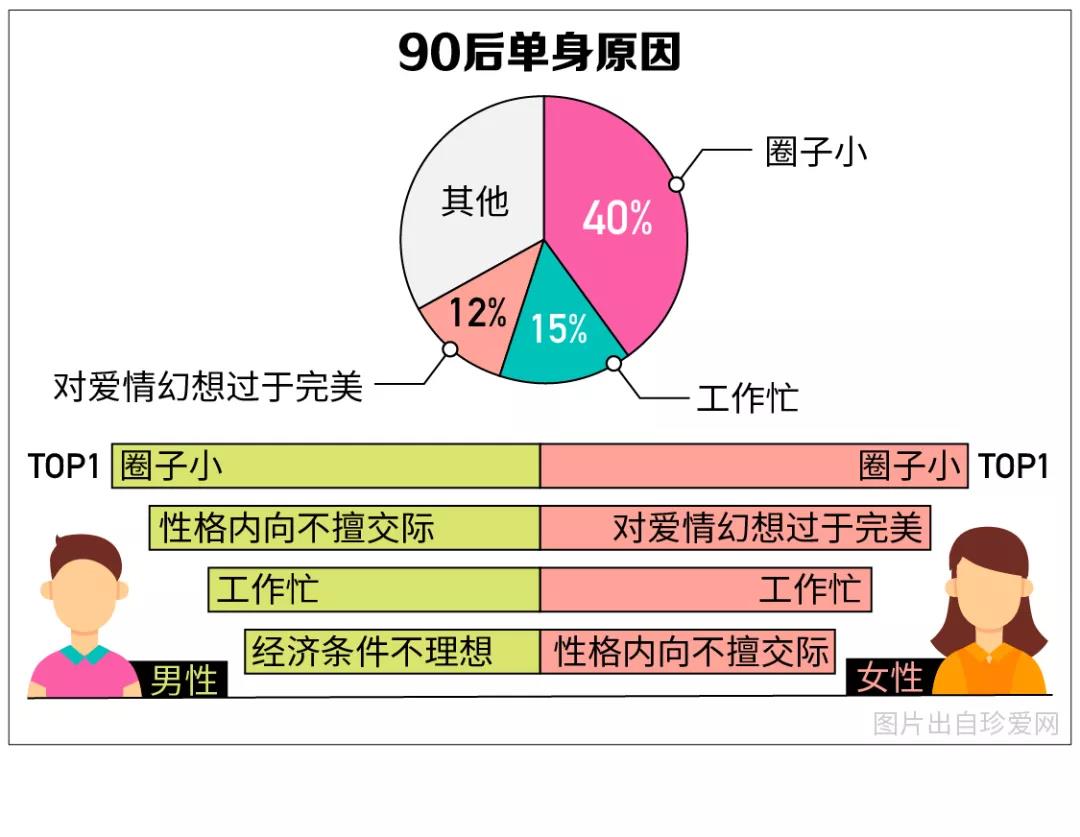 調(diào)查結(jié)果發(fā)現(xiàn),圈子?。?0%)、工作忙(15%)、對愛情幻想過于完美(12%)為90后單身的主要原因。就性別差異而言,除了圈子小之外,男性單身的主要原因是性格內(nèi)向不擅交際(33.53%)、工作忙(32.07%)以及經(jīng)濟(jì)條件不理想(19.02%)。女性單身的主要原因則是對愛情幻想過于完美(29.67%)、工作忙(28.04%)及性格內(nèi)向不擅交際(14.82%)。從學(xué)歷背景看,學(xué)歷越高越容易受困于生活圈子小和工作忙帶來的擇偶問題,而且博士人群對愛情幻想過于完美的比例比其他學(xué)歷的人群更高。