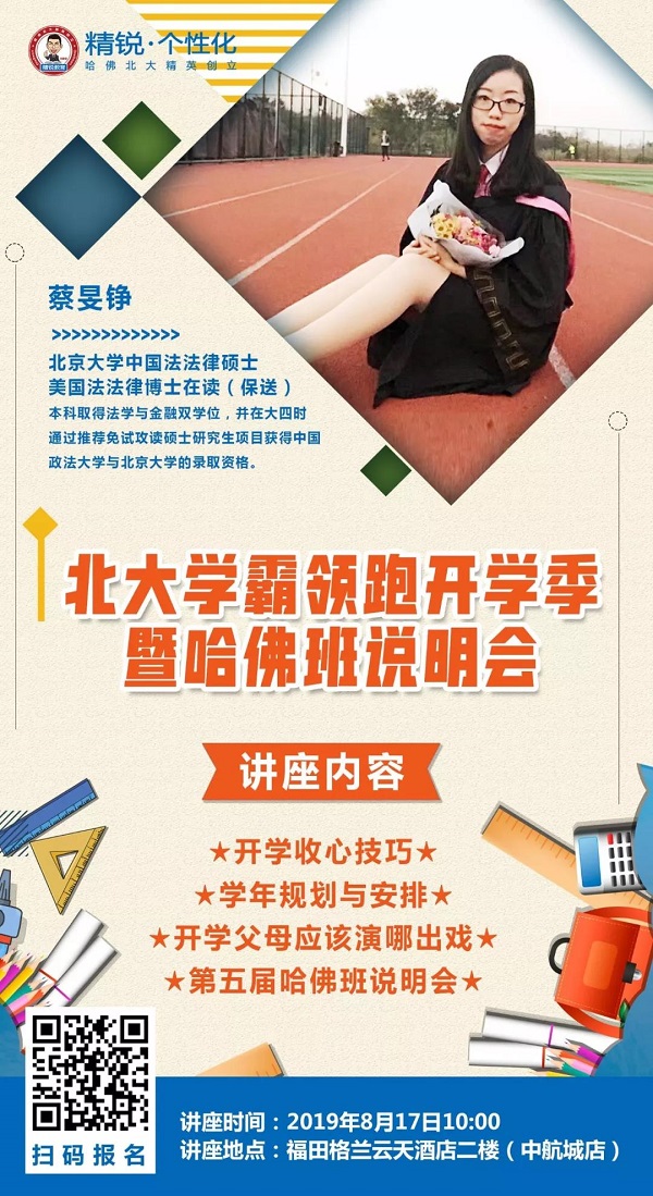 為了幫助深圳的孩子擺脫假期綜合征,快速適應(yīng)新年級(jí)帶來(lái)的變化,《北大學(xué)霸領(lǐng)跑開(kāi)學(xué)季》公益講座特別邀請(qǐng)到北大學(xué)霸蔡旻錚學(xué)姐于本周六和深圳的家長(zhǎng)、學(xué)生分享開(kāi)學(xué)收心技巧,如何做好學(xué)年規(guī)劃與安排。