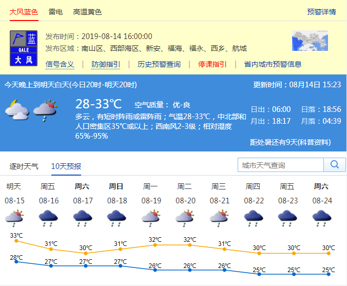 風力逐漸減弱,深圳市氣象臺于2019年08月14日17時15分在南山區(qū),西部海區(qū)和寶安區(qū)(新安、福海、福永、西鄉(xiāng)、航城街道)取消大風藍色預(yù)警。