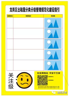 出租屋將分為寬管級(jí)(綠標(biāo))、關(guān)注級(jí)(黃標(biāo))、嚴(yán)管級(jí)(橙標(biāo))、禁止級(jí)(紅標(biāo))四個(gè)級(jí)別。結(jié)合房屋二維碼對(duì)四個(gè)級(jí)別實(shí)行動(dòng)態(tài)標(biāo)色管理,以房屋二維碼的底色來標(biāo)注。