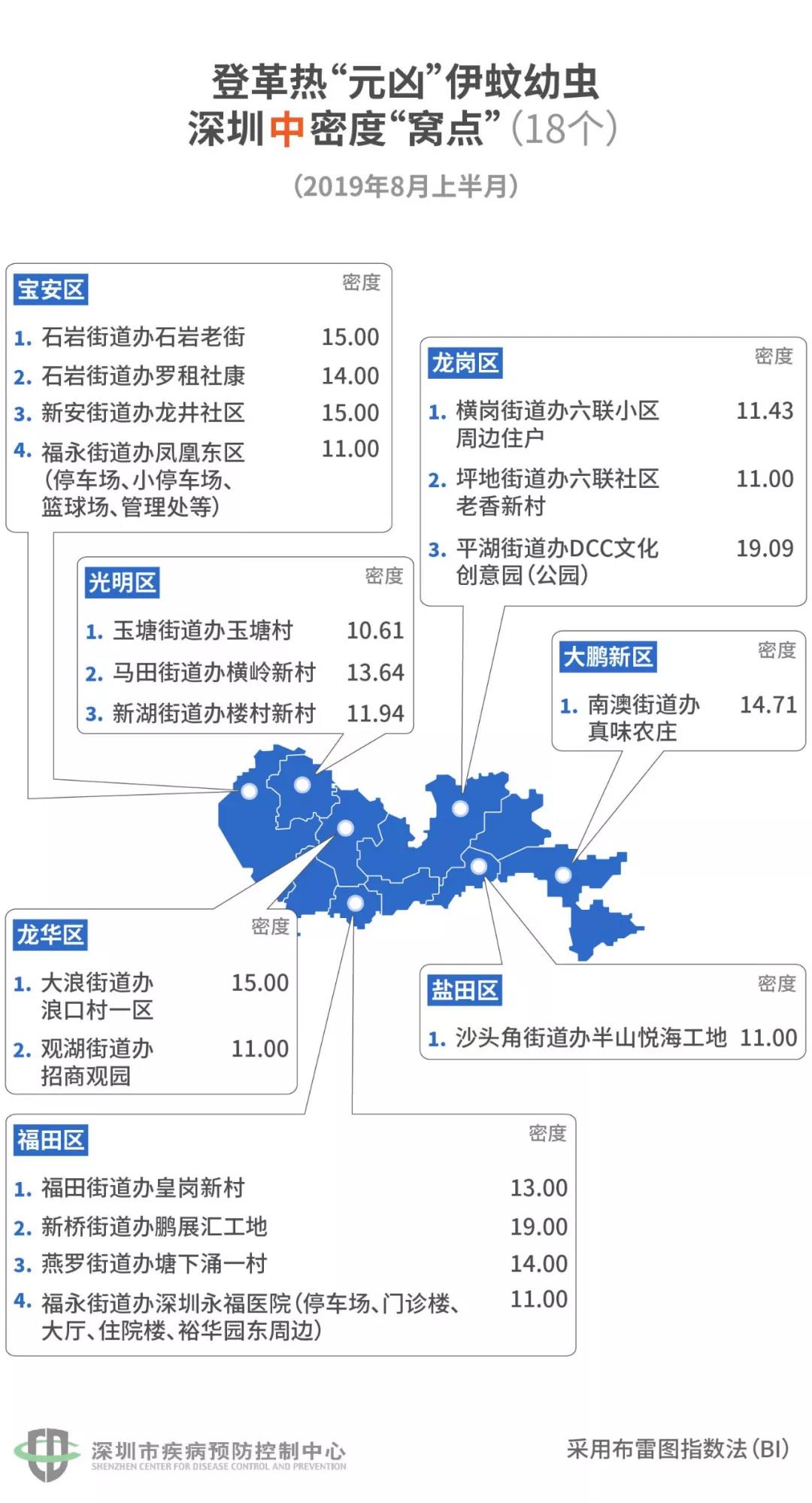 2019年8月1日-15日,通過(guò)對(duì)全市419個(gè)監(jiān)測(cè)點(diǎn)進(jìn)行伊蚊密度監(jiān)測(cè),發(fā)現(xiàn)深圳蚊媒密度總體較高,不符合防控要求的監(jiān)測(cè)點(diǎn)有237個(gè),占了56.56%,其中——高傳播風(fēng)險(xiǎn)的有3個(gè)點(diǎn);中度傳播風(fēng)險(xiǎn)的有64個(gè)點(diǎn);低度傳播風(fēng)險(xiǎn)的有179個(gè)。