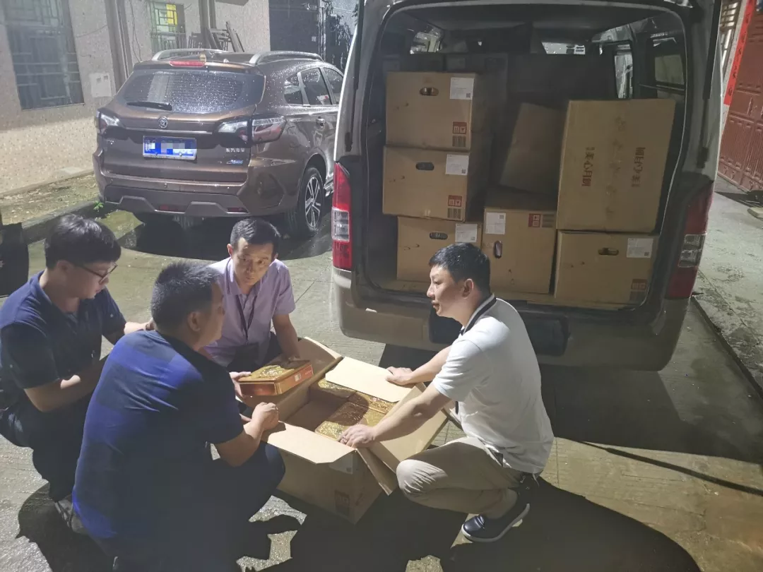 執(zhí)法人員在嫌疑人住所外清點、扣押涉案的月餅