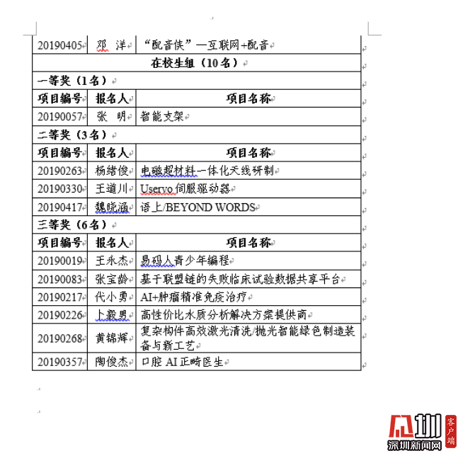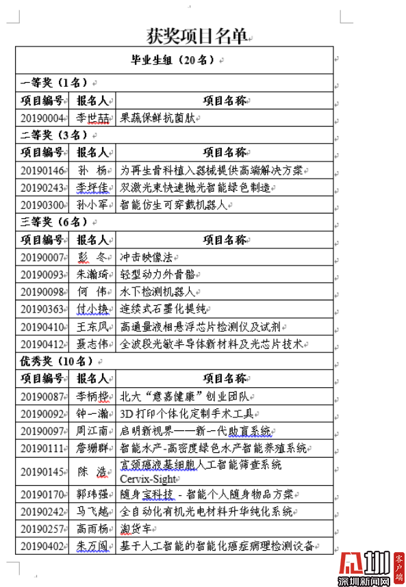 據(jù)了解,2019深圳“逐夢(mèng)杯”大學(xué)生創(chuàng)新創(chuàng)業(yè)大賽由市人力資源保障局、市教育局、團(tuán)市委共同主辦,深圳大學(xué)等15所高校協(xié)辦,市公共就業(yè)服務(wù)中心承辦。大賽自2016年開(kāi)始,每年舉辦一屆,今年是第四屆。本屆大賽延續(xù)“逐夢(mèng)青春創(chuàng)贏未來(lái)”的主題,也是首次將港澳籍青年創(chuàng)業(yè)者納入?yún)①惙秶?。大賽于今?月正式啟動(dòng),共有397個(gè)項(xiàng)目報(bào)名參賽,參賽項(xiàng)目歷經(jīng)資格初審、初賽、復(fù)賽、決賽,最終30個(gè)優(yōu)秀創(chuàng)業(yè)項(xiàng)目脫穎而出,贏得大獎(jiǎng)。其中,“果蔬保鮮抗菌肽”項(xiàng)目獲畢業(yè)組一等獎(jiǎng),“智能仿生可穿戴機(jī)器人”等3個(gè)項(xiàng)目獲畢業(yè)組二等獎(jiǎng),“沖擊映像法”等6個(gè)項(xiàng)目獲畢業(yè)組三等獎(jiǎng),“北大‘意嘉健康’創(chuàng)業(yè)團(tuán)隊(duì)”等10個(gè)項(xiàng)目獲畢業(yè)組優(yōu)秀獎(jiǎng);“智能支架”項(xiàng)目獲在校生組一等獎(jiǎng),“Uservo伺服驅(qū)動(dòng)器”等3個(gè)項(xiàng)目獲在校生組二等獎(jiǎng),“易碼人青少年編程”等6個(gè)項(xiàng)目獲在校生組三等獎(jiǎng)。