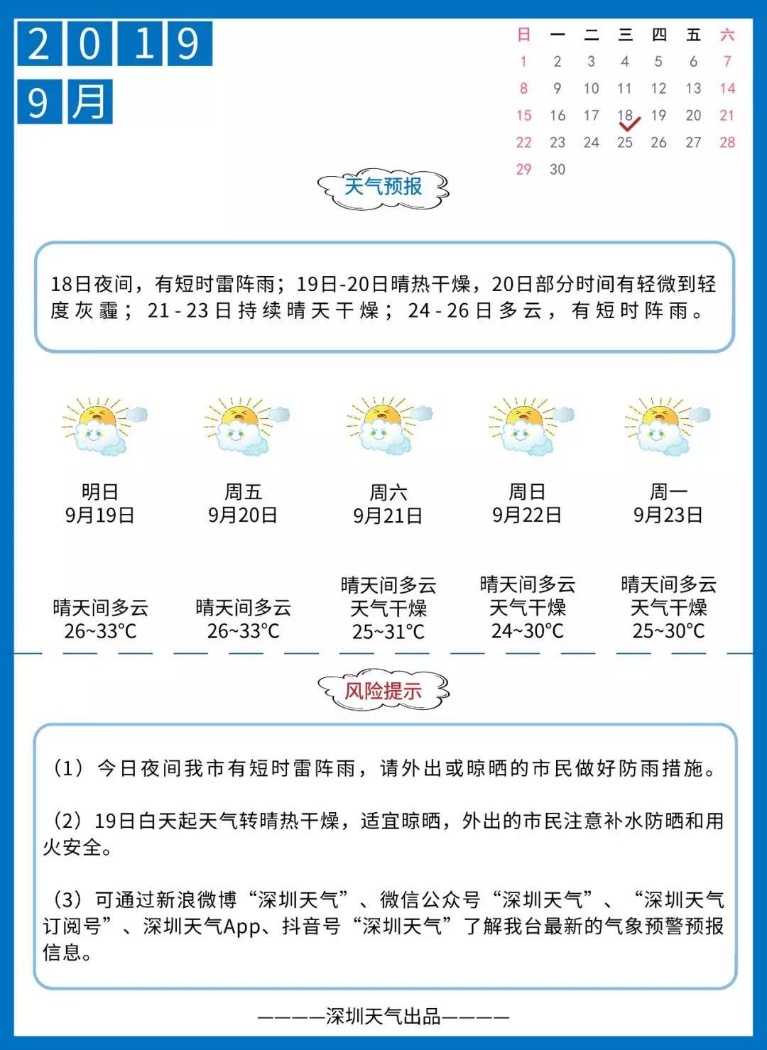 預計18日夜間有短時雷陣雨,19-20日天氣晴熱干燥,氣溫在26-33℃,20日部分時間有輕微到輕度灰霾,21-23日持續(xù)晴天干燥,24-26日多云,有短時陣雨。深圳天氣提醒市民,今夜外出注意防范局地短時雷雨,明日起外出注意補水防曬和用火安全!