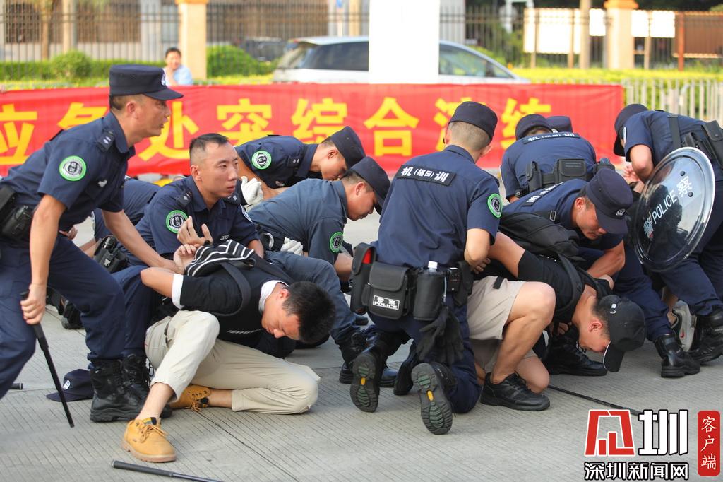 下午5時,隨著演練總指揮福田區(qū)委副書記黃曉鵬一聲令下,演練正式開始?;蕧徣刖硰d,黑衣“不法分子”拒檢、傷人、拉橫幅鬧事,海關(guān)、邊檢呼叫增援……事態(tài)步步升級,觸發(fā)皇崗口岸聯(lián)勤聯(lián)動機(jī)制,根據(jù)應(yīng)急預(yù)案,隨著各項(xiàng)指令有條不紊地下達(dá),皇崗口岸派出所、福田反恐大隊(duì)、武警深圳支隊(duì)、福田交警大隊(duì)、福田急救中心、福田街道武裝部民兵應(yīng)急分隊(duì)、皇崗口岸管理處等聯(lián)勤聯(lián)動力量,迅速趕到現(xiàn)場進(jìn)行處置。在“法律告知”無效、危險(xiǎn)行為繼續(xù)的情況下,警方果斷實(shí)施抓捕,將黑衣“不法分子”一網(wǎng)打盡,在最短時間內(nèi)恢復(fù)了皇崗口岸的正常秩序。