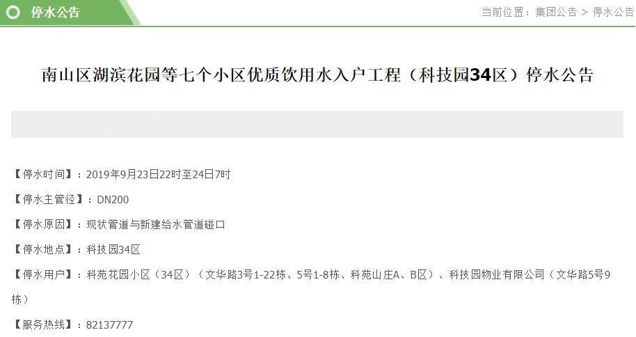 停水時(shí)間:2019年9月23日22時(shí)至24日7時(shí)