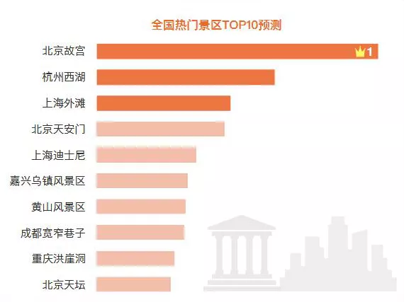 根據(jù)交通運輸部科學研究院報告顯示,國慶全國熱門景區(qū)TOP10北京故宮、杭州西湖、上海外灘位列前三位,另外還有北京天安門、上海迪士尼、嘉興烏鎮(zhèn)風景區(qū)、黃山風景區(qū)、成都寬窄巷子、重慶洪崖洞、北京天壇位列其中。