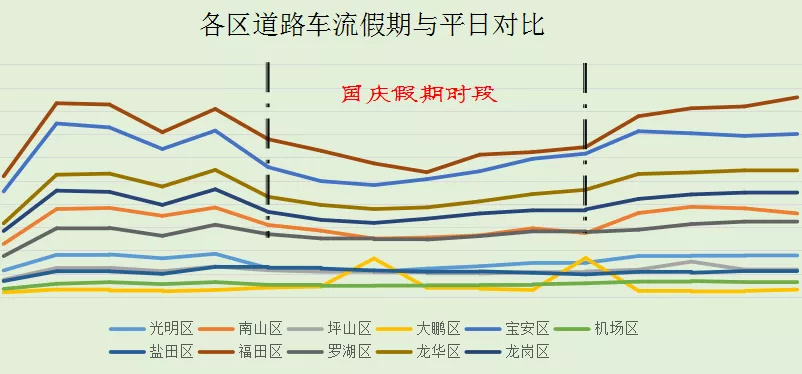 市內(nèi)交通除大鵬和鹽田區(qū)較平日有所上升外,其余各區(qū)均較平日車(chē)流減少30%左右。假日期間車(chē)流將集中在非上下班高峰的時(shí)間段。