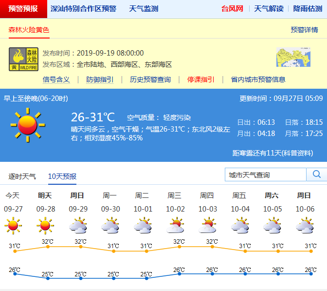 見(jiàn)圳客戶(hù)端·深圳新聞網(wǎng)2019年9月27日訊 深圳未來(lái)一周晴天間多云,陽(yáng)光充足,天氣干燥,其中29-30日云量增加,濕度略有加大;10月初晴天間多云。