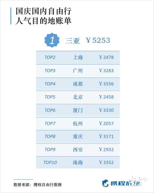 而哪些目的地在國慶期間最能吸引自由行游客?根據(jù)攜程自由行數(shù)據(jù),三亞、上海、廣州、成都、北京、廈門、杭州、重慶、西安和珠海。其中國慶前往三亞度假已經(jīng)成為潮流,單次人均花費(fèi)為5253元。
