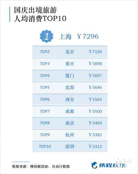 而國慶假期國人出境游花費(fèi)多少錢?據(jù)攜程出境游數(shù)據(jù)顯示,國慶通過攜程旅游平臺(tái)報(bào)名跟團(tuán)游、自由行、定制游等度假產(chǎn)品的人均花費(fèi)是國內(nèi)游價(jià)格的近2倍。出境游消費(fèi)力前十名出發(fā)城市為上海、北京、重慶、廈門、沈陽、西安、成都、南京、杭州和深圳。上海和北京出境游人均花費(fèi)超過了7000元,遠(yuǎn)遠(yuǎn)超過了其他城市。