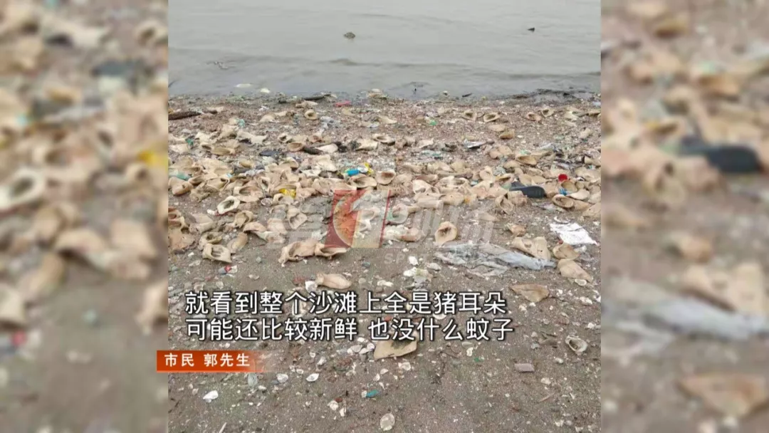 市民郭先生說,前兩天傍晚,他帶孩子到這里時,就已經(jīng)發(fā)現(xiàn)了這一幕。可超過48小時了,海灘上的豬耳朵仍沒有得到清理。