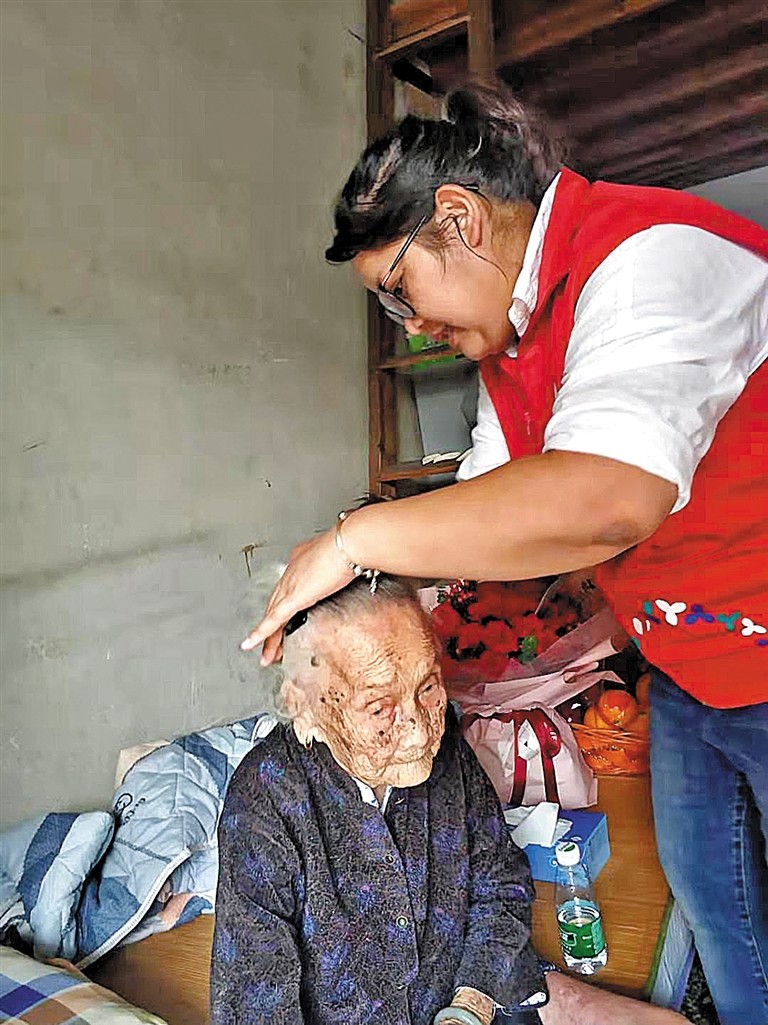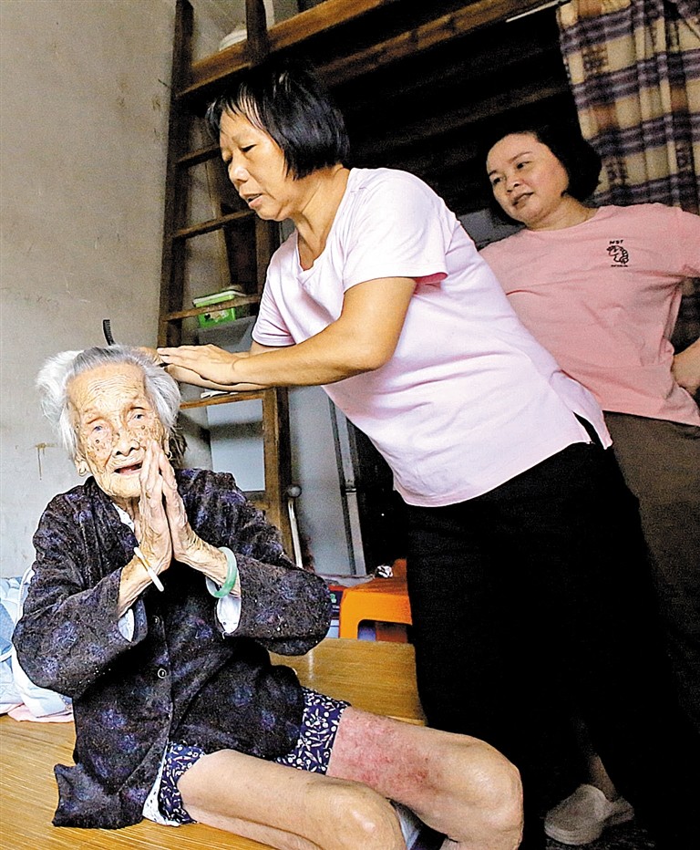 陳汝金老人喜歡打本地花牌,打到了99歲,后來(lái)腰部退化,不能久坐,她才沒有再打花牌。吃飯方面,陳汝金也有自己的主張,不求好不求貴,簡(jiǎn)簡(jiǎn)單單活到老,“外婆以前是生產(chǎn)隊(duì)的炊事員,直到去年她還能自己做飯呢?!痹谖男〗憧磥?lái),如此長(zhǎng)壽的外婆也沒有特別的養(yǎng)生之道,“保持好心態(tài),順其自然就是最長(zhǎng)壽的秘方?!?/p>