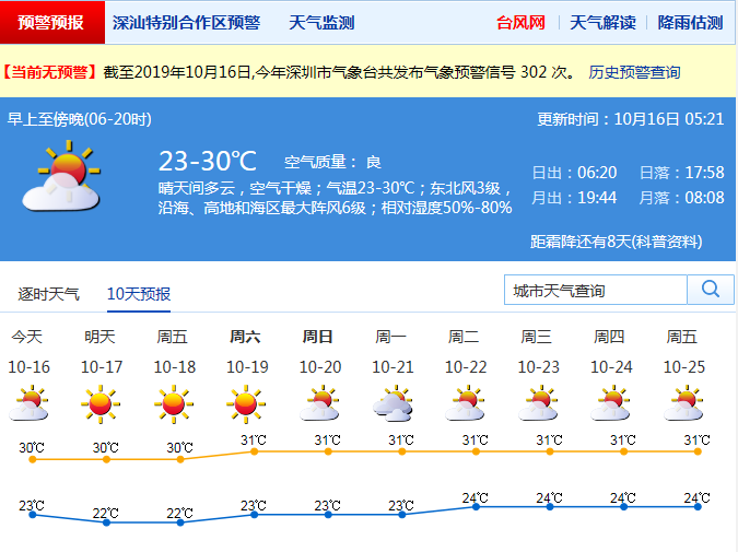 深圳今日晴天間多云,早晚稍涼 最高溫重返30℃