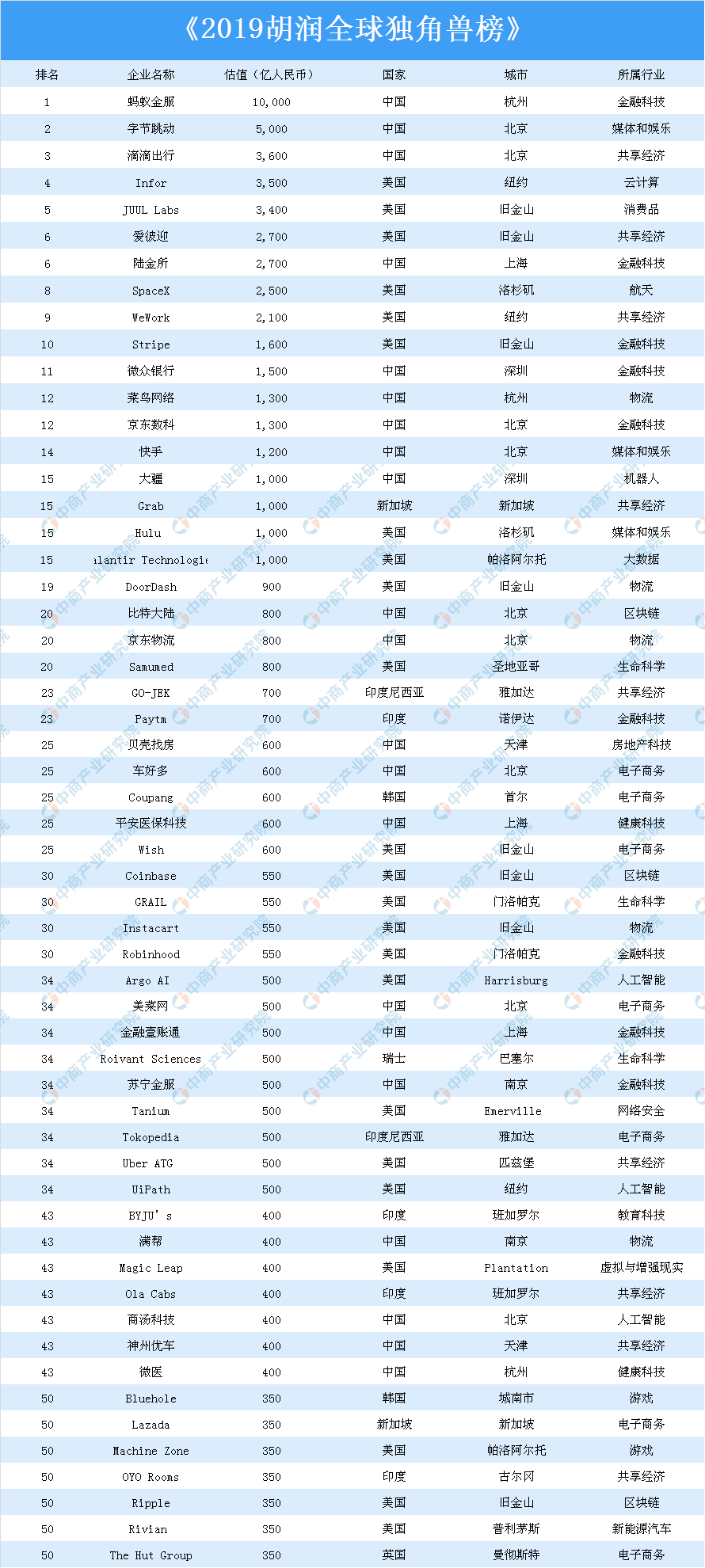 據(jù)悉,這是胡潤(rùn)研究院首次發(fā)布全球獨(dú)角獸榜。此次榜單對(duì)全球估值10億美元以上的科技初創(chuàng)企業(yè)排名,上榜企業(yè)要求創(chuàng)辦不超過(guò)10年,獲得過(guò)私募投資且未上市。本次榜單估值計(jì)算截止日期為2019年6月30日。