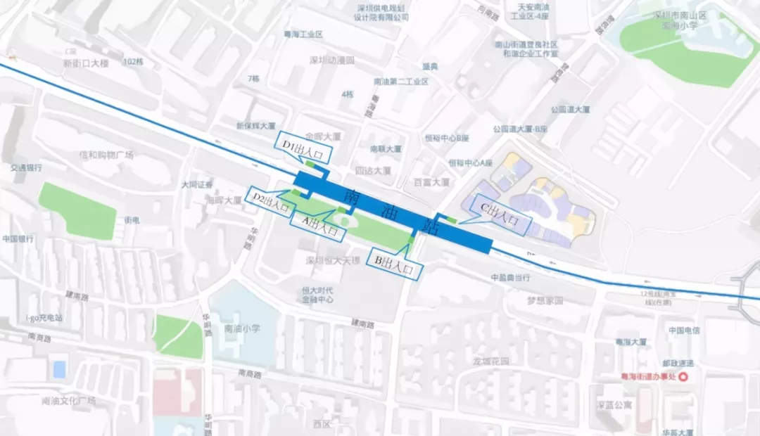 9號(hào)線二期南油站位于南山區(qū)南海大道與登良路交叉口下方,沿南海大道呈南北向敷設(shè),為地下2層車站,地下一層為站廳層,地下二層為站臺(tái)層,車站總長334m,車站出入口共計(jì)5個(gè)A出入口、B出入口、C出入口、D1出入口、D2出入口。B出入口位于恒大天璟北側(cè),C出入口位于來福士廣場一側(cè)登良路與南海大道交匯處,D1出入口位于金暉大廈東側(cè),A、D2出入口位于南海大道與華明路交匯處。