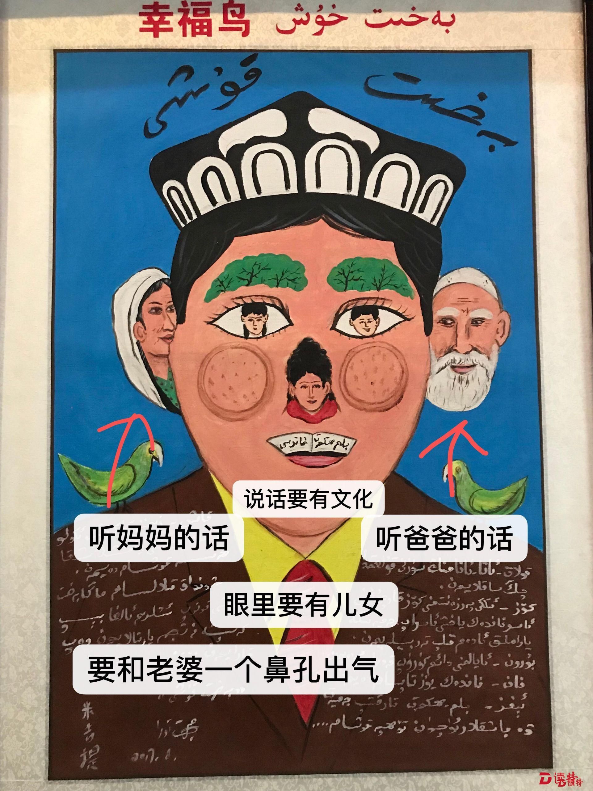 牧民的帳篷、肥壯的牛羊、路旁的榆錢樹……在刀郎農名畫展廳里記者看到,平日生活中隨處可見的事物一一被刀郎人在勞動和生活中用敏銳的目光捕捉,并將其躍然紙上,幽默中透視矛盾,夸張中充滿情緒宣泄,一幅幅作品活靈活現、色彩斑斕,讓人眼花繚亂,構成了“刀郎農民畫”畫家在處理反映現實主義和浪漫主義別具一格的藝術特色。