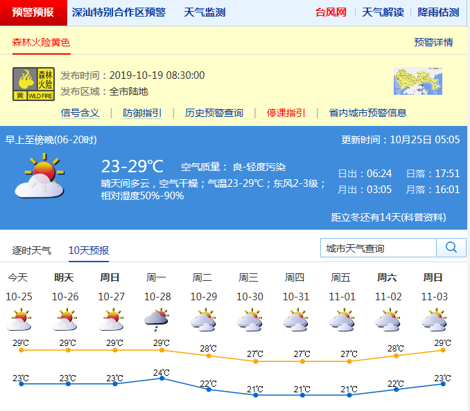 見(jiàn)圳客戶端·深圳新聞網(wǎng)2019年10月25日訊 深圳市氣象局預(yù)計(jì),25-27日晴天間多云,25日氣溫23-29℃;28-29日云量增多,部分時(shí)間有分散小雨;30-31日晴天間多云。