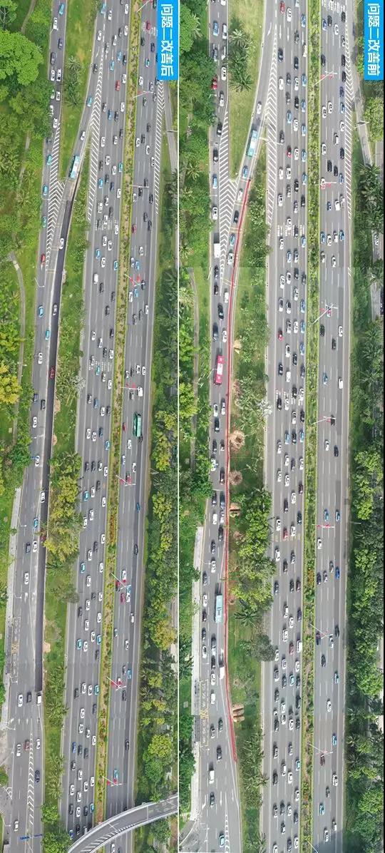 同時,造成沙河西右轉(zhuǎn)濱海大道處擁堵的,還有一個原因是主道車流與原輔道車流匯合后,局部交織沖突嚴(yán)重。為此,交警壓縮了輔道綠化隔離帶,將2車道擴寬為3車道!原輔道車流無需變道,即可順利通行。
