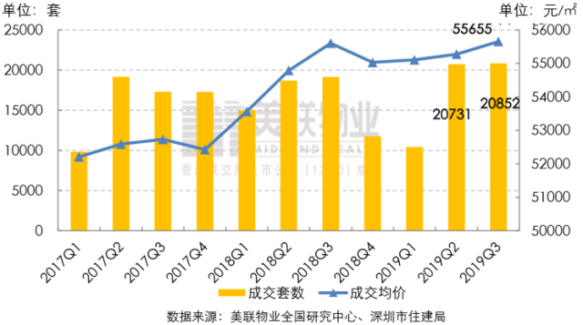 2019年第三季度二手住宅市場延續(xù)第二季度成交熱度,共備案20852套二手住宅,再創(chuàng)三年來季度成交量新高,較今年第二季度上升0.6%,同比去年第三季度上升8.9%;總成交面積約173.80萬㎡。美聯(lián)物業(yè)(深圳)藍籌住宅價格方面,今年第三季度全市二手住宅的成交均價為55655元/㎡,較第二季度上漲0.7%,同比去年第三季度上漲0.1%。