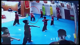 ▲武術(shù)教練拿棍子扔向?qū)W員