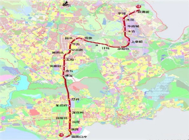 站點:福田口岸、福民、崗廈、崗廈北、蓮花村、冬瓜嶺、孖嶺、雅寶、南坑、光雅園、五和、坂田北、貝爾路、華為、崗頭、雪象、甘坑、涼帽山、上李朗、木古、華南城、禾花、平湖、雙擁街