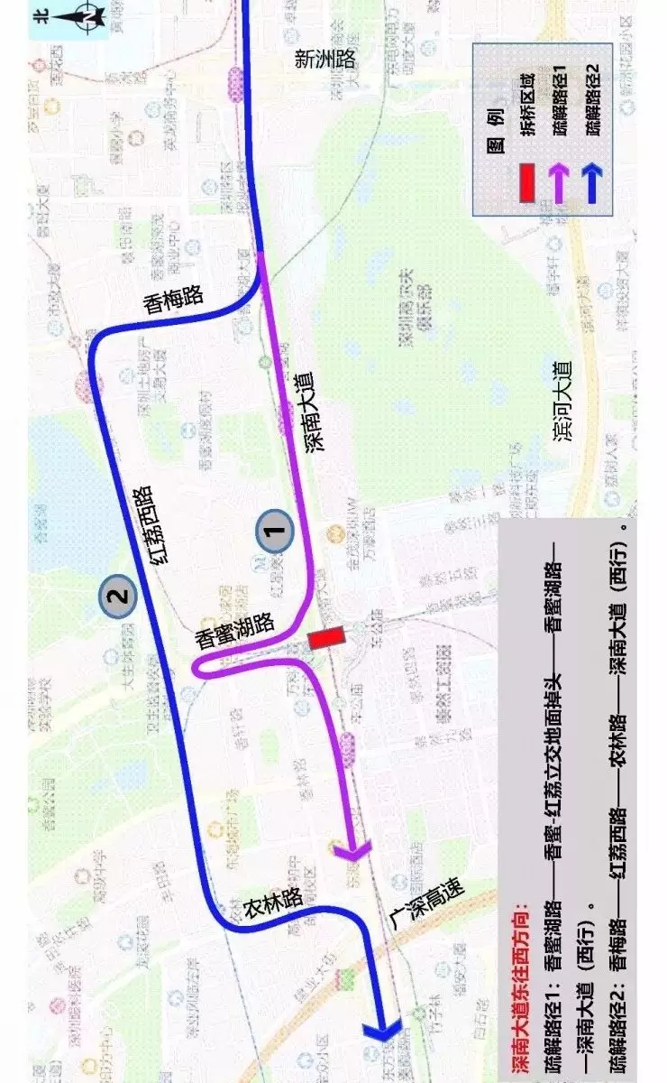 疏解路徑1:香蜜湖路→香蜜-紅荔立交地面掉頭→香蜜湖路→深南大道(西行)