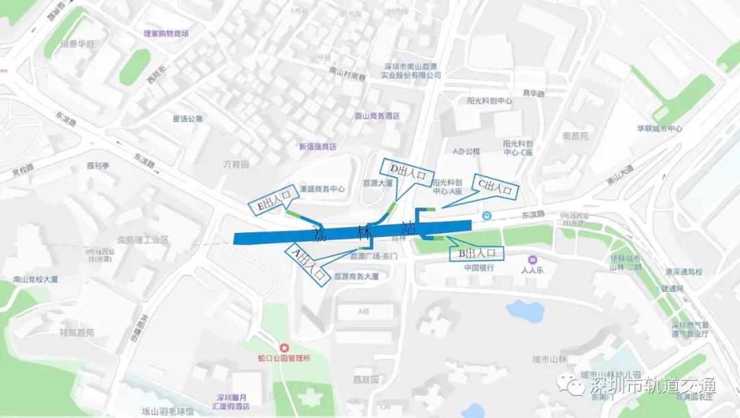 其中,A出入口位于荔園商務(wù)大廈北側(cè),B出入口位于城市山林廣場(chǎng)北側(cè),C出入口位于陽光科創(chuàng)南側(cè),D出入口位于荔源大廈東側(cè),E出入口位于濠盛商務(wù)中心南側(cè)。