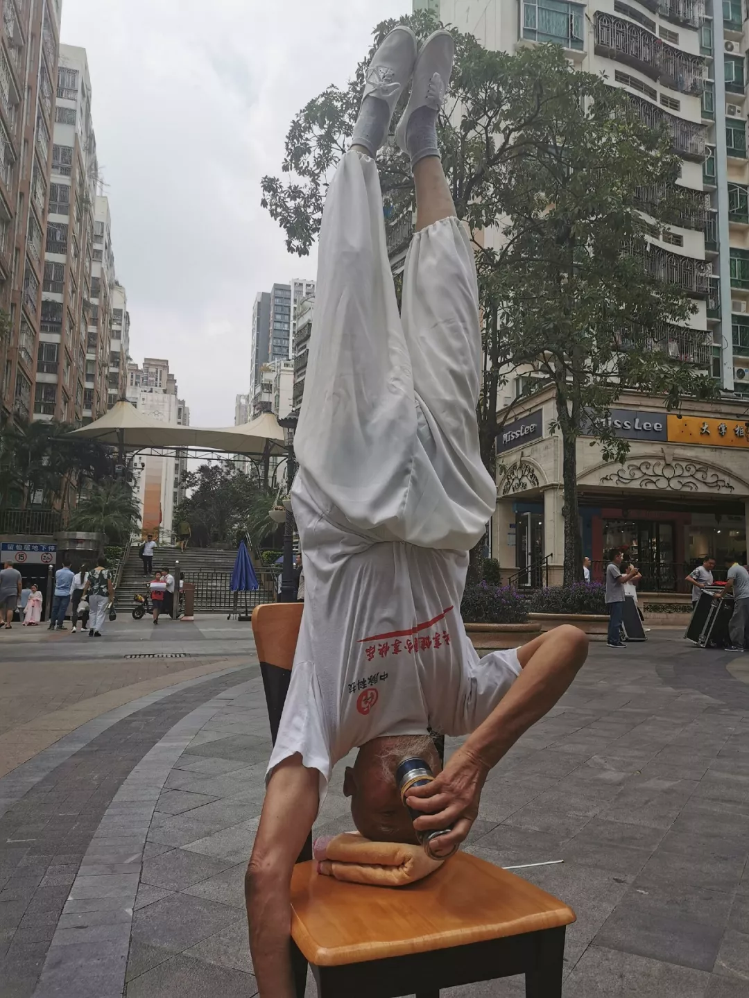 采訪當(dāng)日,記者正在調(diào)試相機(jī)的時(shí)候,忽聞?wù)坡曀钠穑瓉砦鹤谛庞衷趶V場上秀出拿手絕活“倒立”:
